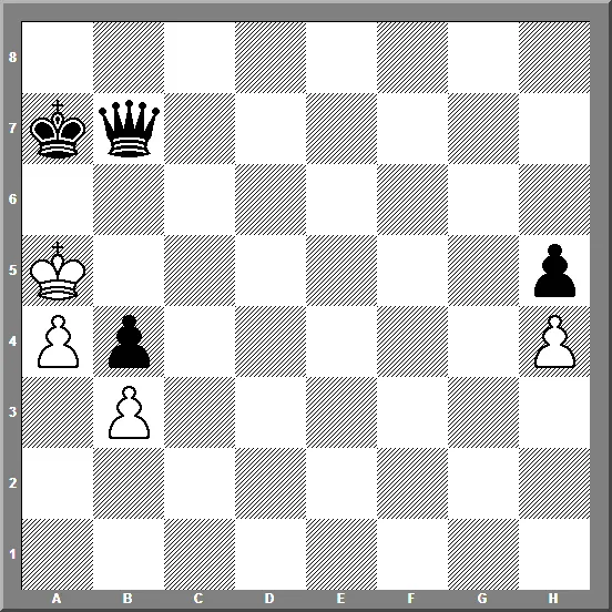 Tương tự, mặc dù bên Trắng còn 3 quân Tốt a4, b3, h4 nhưng những quân Tốt này không di chuyển được. Quân Vua không thể di chuyển đến những ô a6, b6, b5 vì bị quân Hậu Đen kiểm soát và Vua Trắng không bị chiếu nên kết quả là hòa cờ (Pat).
